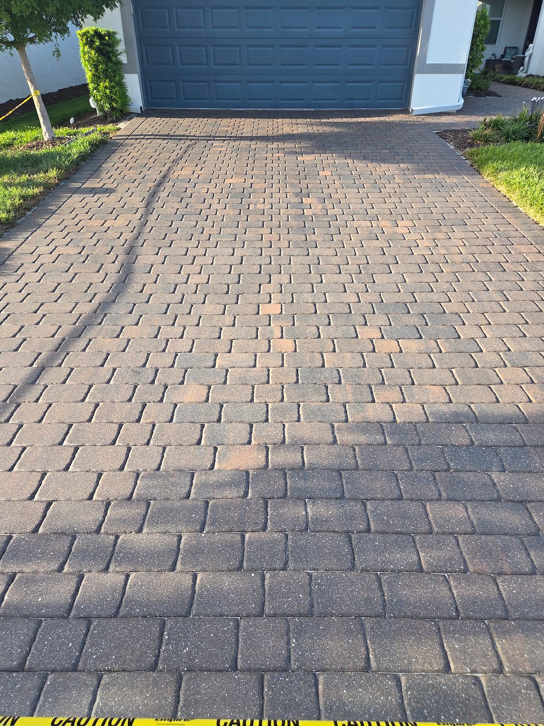 First, we thoroughly cleaned both the front driveway and the rear lanai pavers. Cleaning removes dirt, organic growth, and surface deposits that hide the colors and textures of the pavers. With the surface clean, the pavers were ready for the next step, joint filling and compaction.